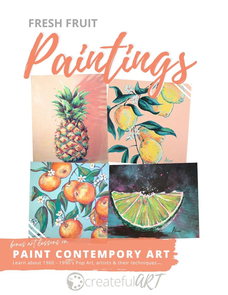 Each of the four fruit themed painting workshops in this fresh fruit art bundle are inspired by the pop art movement. The workshops tap into what's currently trending and popular as decor. In each of the workshops, we’ll be exploring the timeless appeal of fruits like lemons, limes, oranges, and pineapple, adding to them our own creative touches inspired by the playful spirit of pop art.