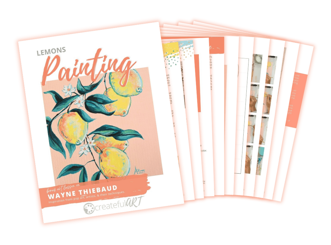 You, as the artist, will have complete creative control to follow along as you paint your Lemons painting. Or, express yourself and be creative by choosing the colors, design, textures, and brushstrokes to paint your lemons, leaves, flowers, and background. Allowing the artist to be creative while learning about art is what Createful Art is all about. Let’s start creating!