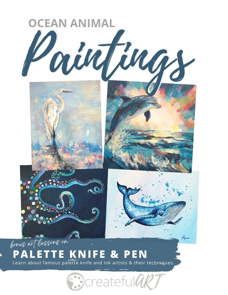 Welcome to an exciting painting workshop bundle where you'll explore the vibrant world of the marine animal paintings using paint pens, ink, and palette knives!