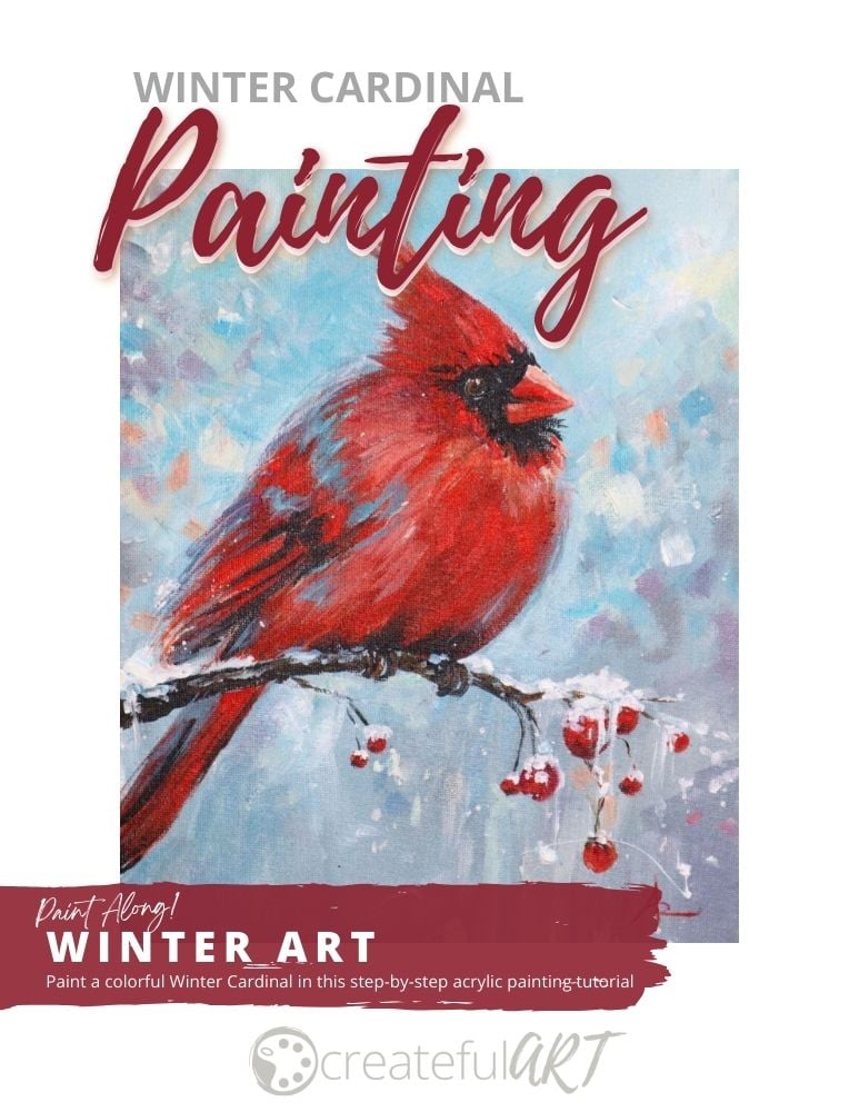 You, as the artist, will have complete creative control to follow along as you paint your winter cardinal landscape painting. Or, express yourself and be creative by choosing the colors, design, textures, and brushstrokes to paint your cardinal, background, and branch. Allowing the artist to be creative while learning about art is what Createful Art is all about. Let’s start creating!