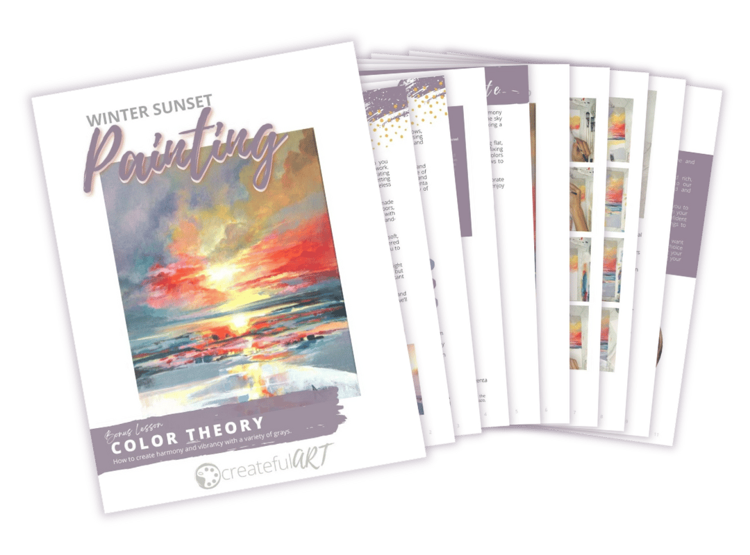 This Winter Sunset painting workshop will guide you through all of the steps and techniques necessary to complete your own loose winter sunset painting and comes with: